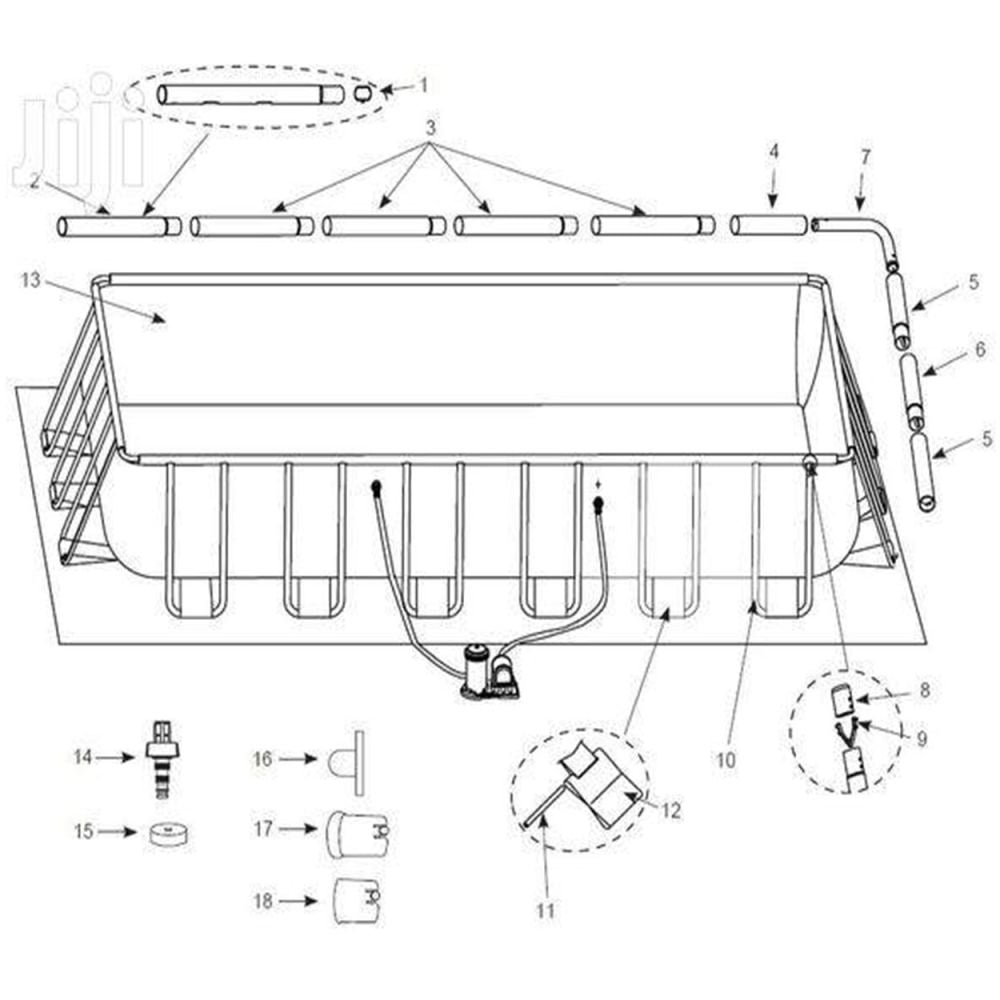 - Pishina është e pajisur me mbulesë, e cila mundëson mbrojtjen nga papastërtitë, shkallë për tu futur më lehtë në pishinë, shtresë e cila vendoset përtokë, e cila mundëson mbrojtje efikase të pishinës nga dëmtimet të cilat mund të vijnë nga kërcimet apo goditjet e ndryshme.